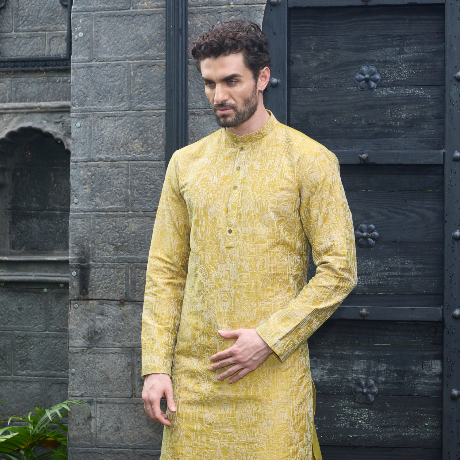 Guacamole colour Kurta with all over surface detailing of Medieval embroidery in monotone look. The enseble is teamed up with matching trousers.