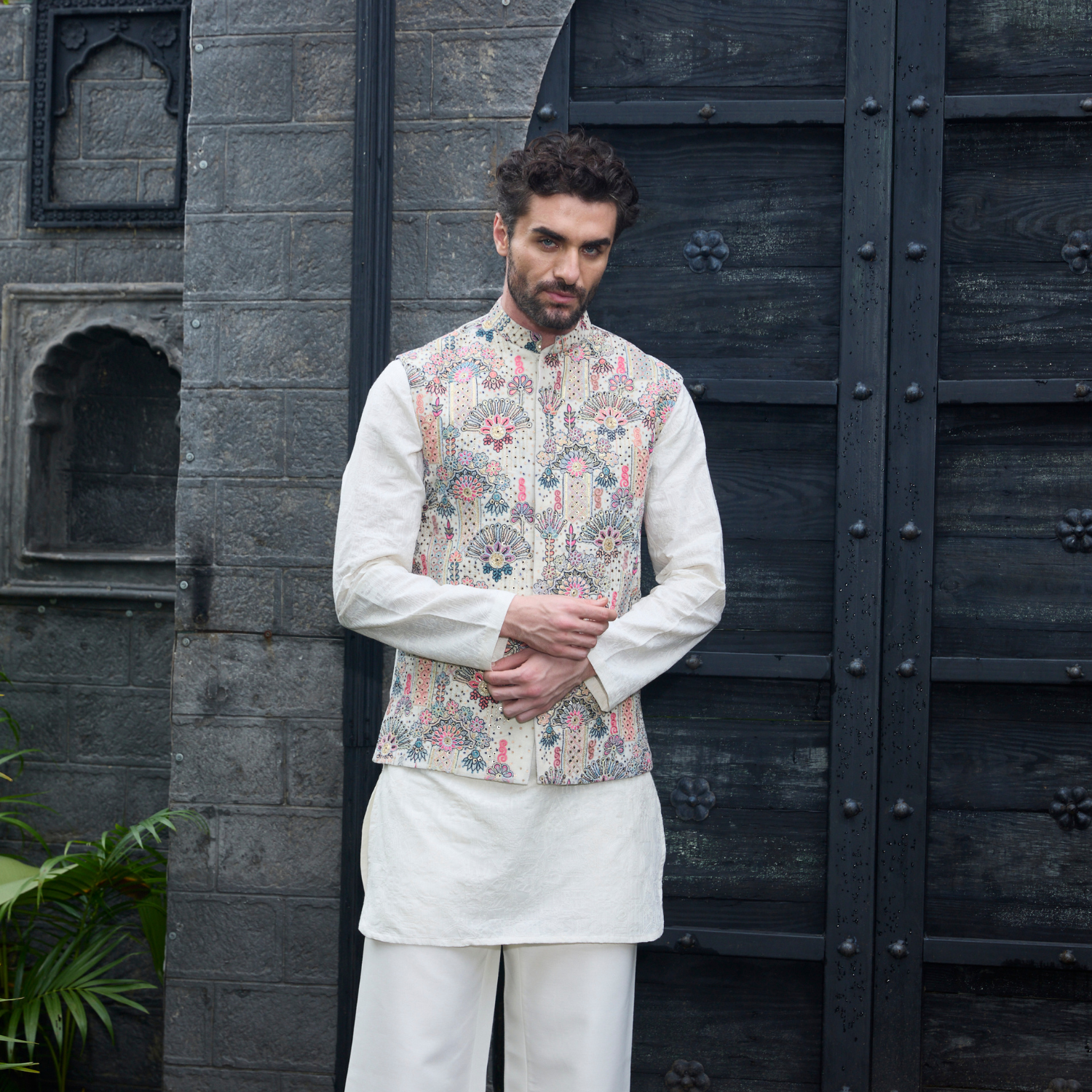 Hand embroidered off white Jacket with sequins & thread detailing all over. Teamed up with monotone look kurta & churidar.