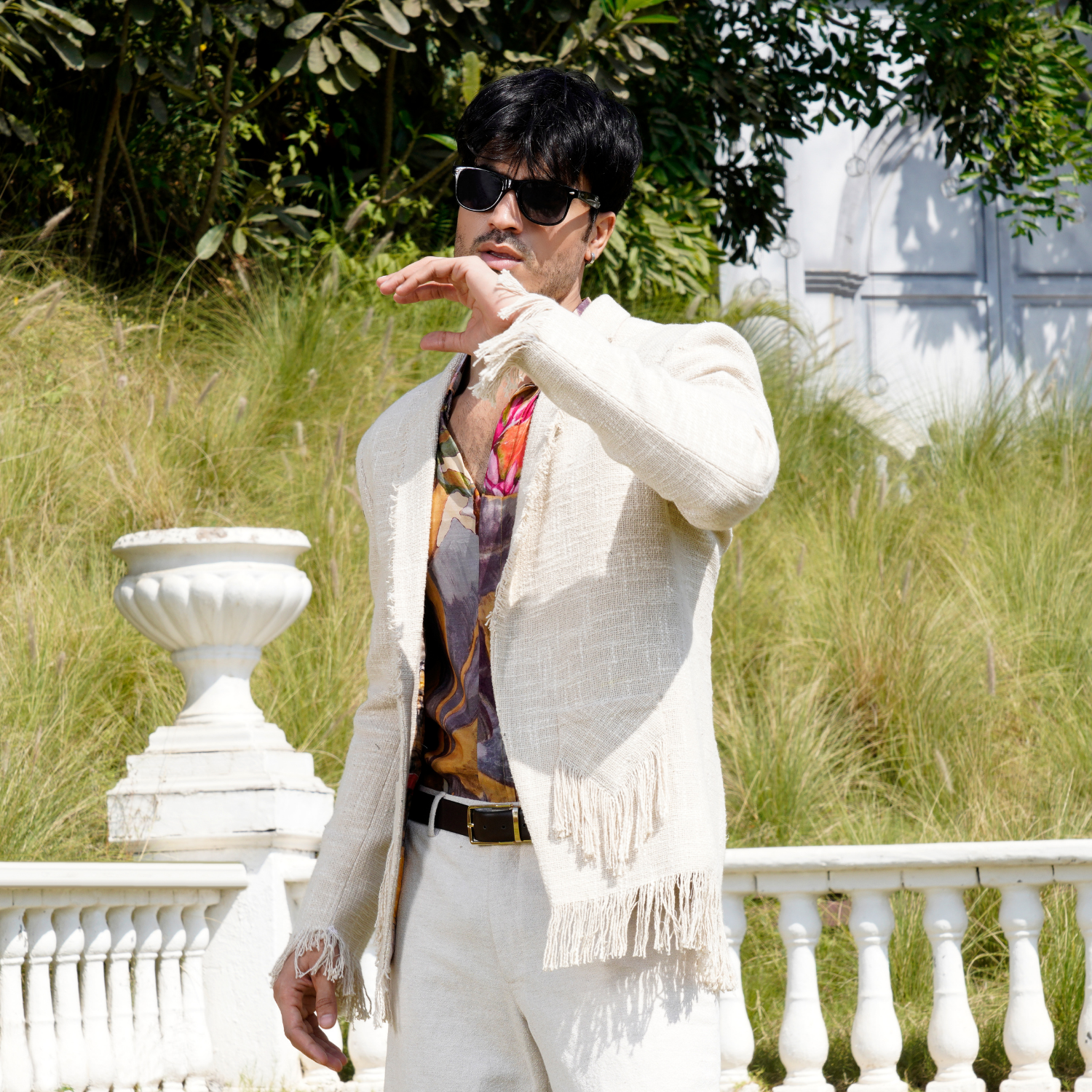 Ivory textured jute blazer with fray detailing on sleeve, hem and pocket flap. Paired with abstract floral printed shirt and coordinated flared trouser.