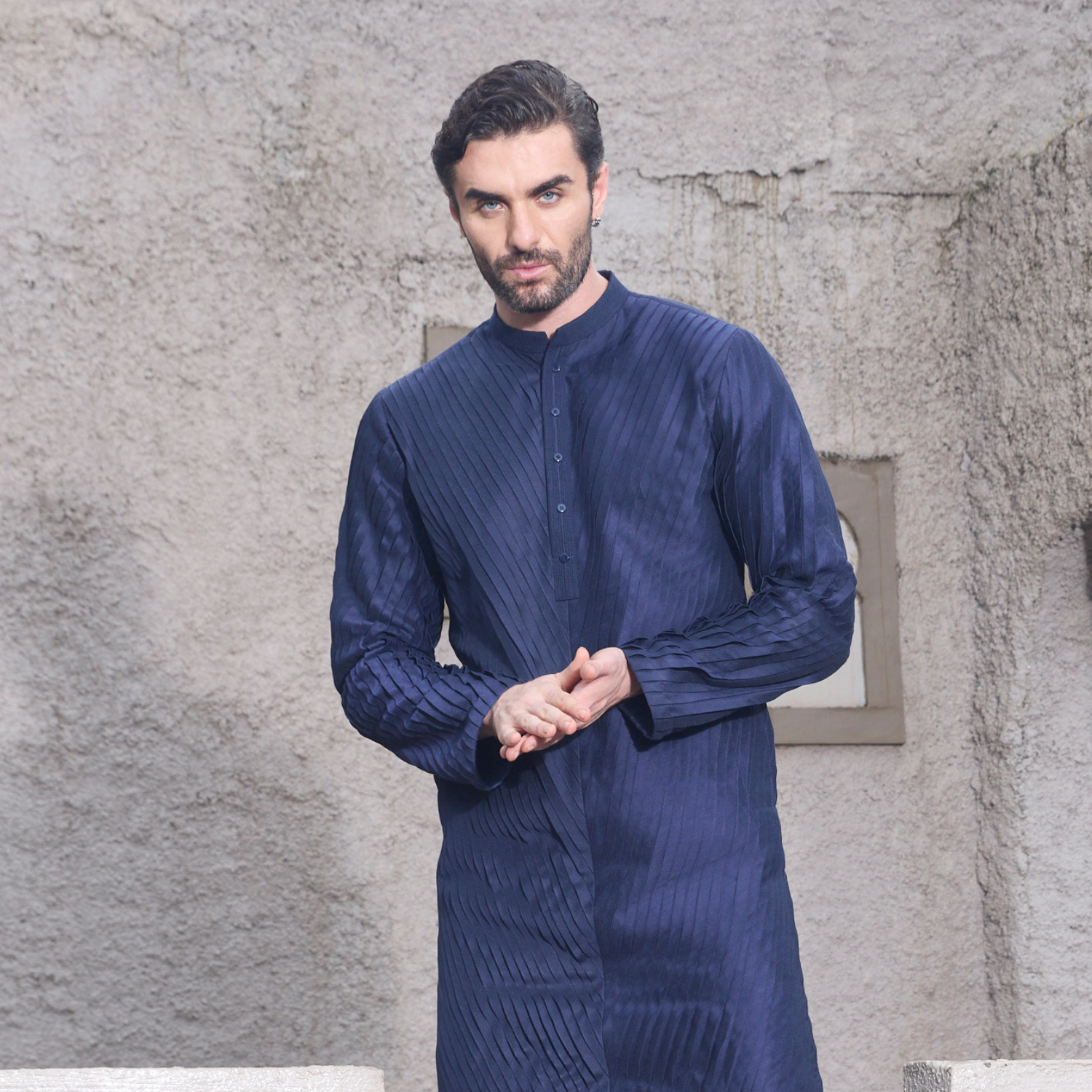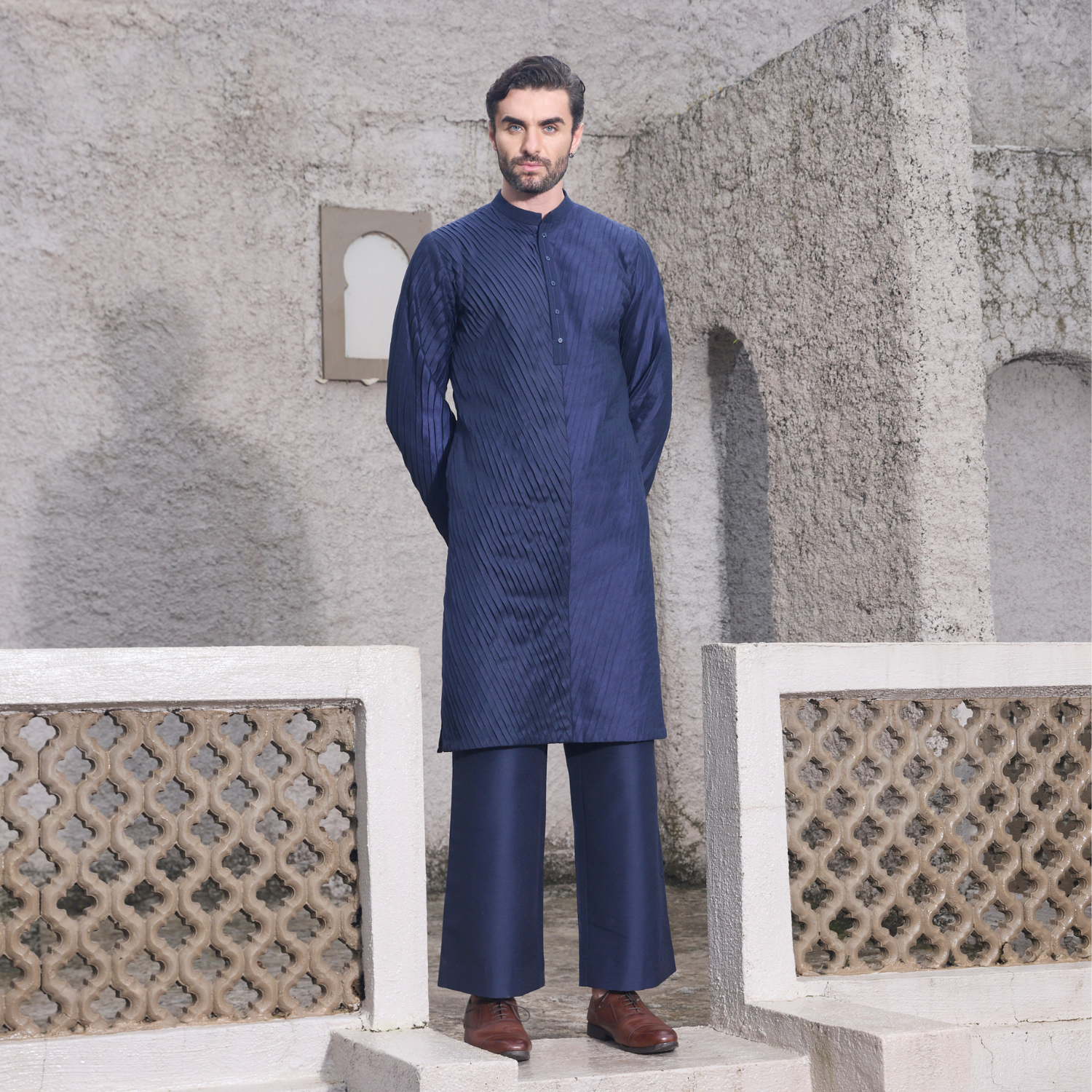 Midnight blue full hand pleated Kurta teamed up with matching flaired trouser.