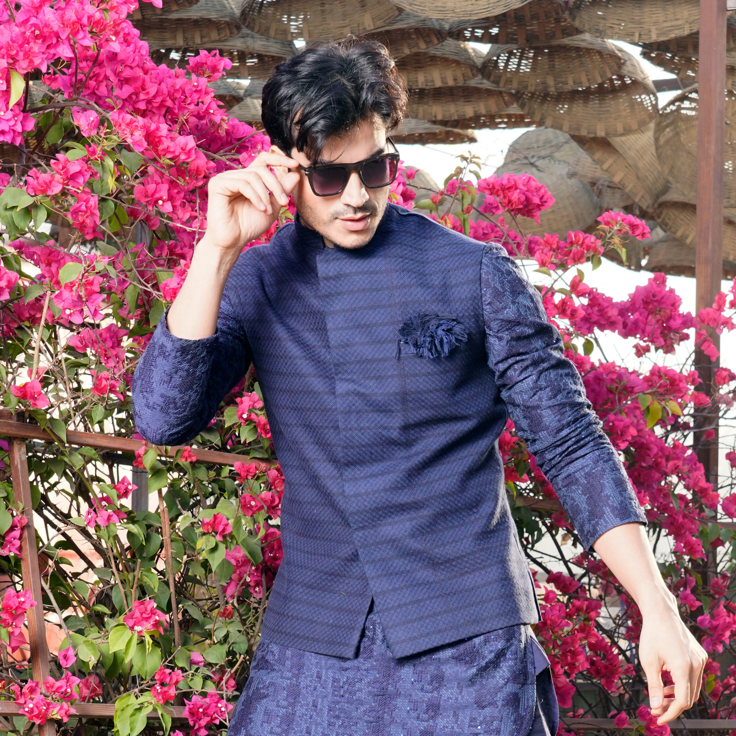 Midnight blue Hopsack embroidered horizontal striped jacket. Paired with matching milange embroidered short kurta and flared trouser. Accessorised with monotone fringe brooch.