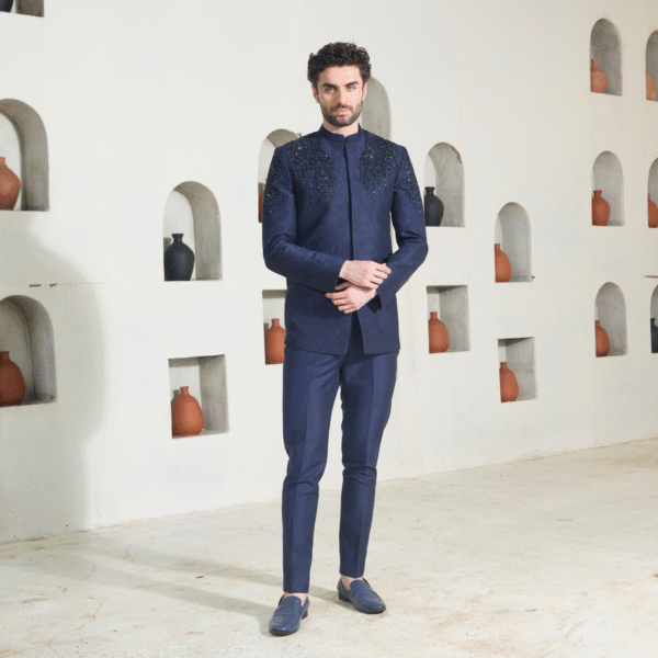 Midnight blue Jodhpuri with all over surface detailing of Quatrefoil in monotone look. Wings of Eternity embelished in bugle beads on shoulder & sleeve. The ensemble is paired with midnight blue trouser.