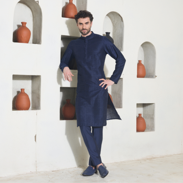 Midnight blue Kurta with all over surface detailing of Runes embroidered in monotone look. The enseble is teamed up with midnight blue trousers.