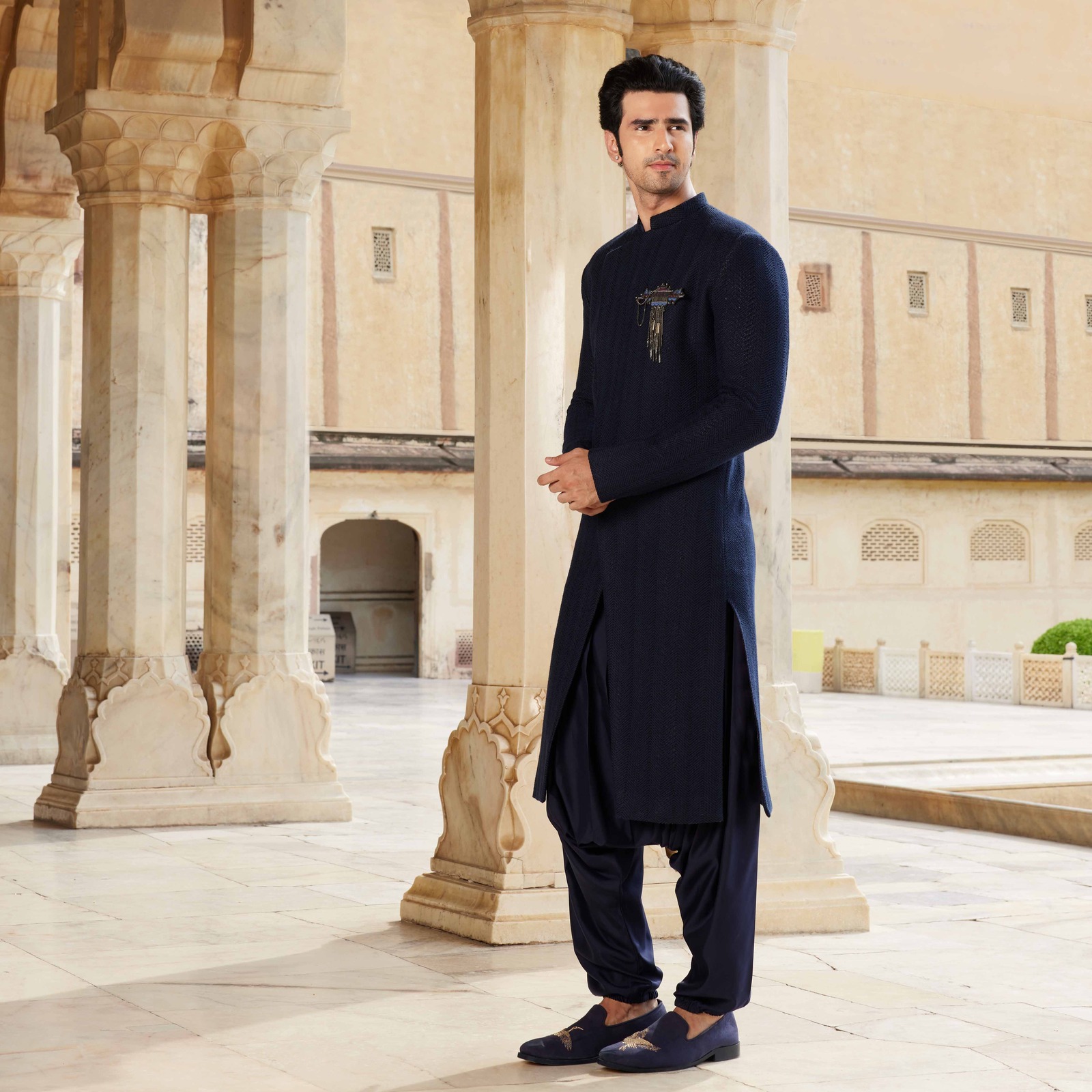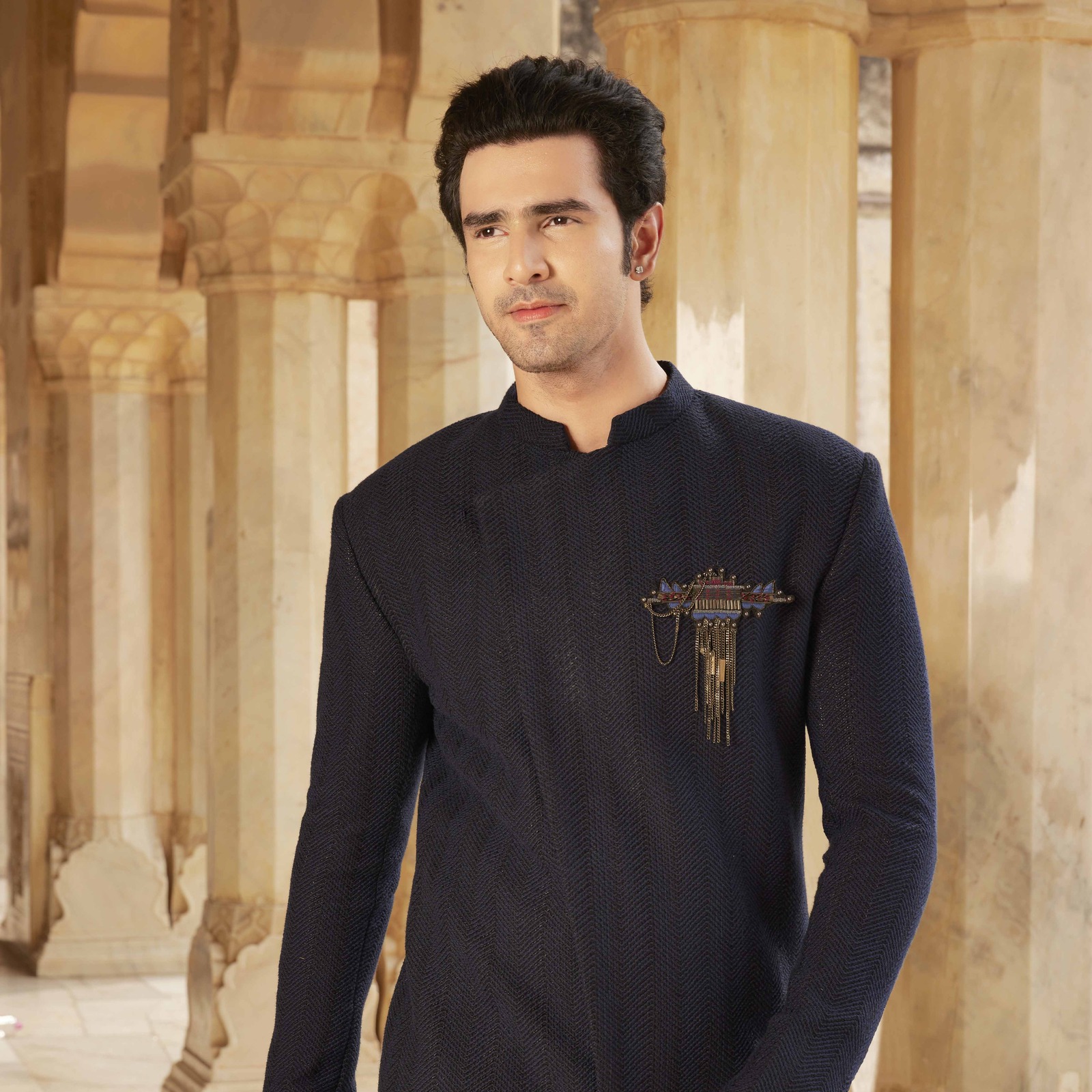 Midnight blue long asymmetric overlapped chevron textured bandhgala. Matching Afghani for bottoms. Accessorised with brooch in antique gold. Styled with coordinated loafers with crane embroidery.