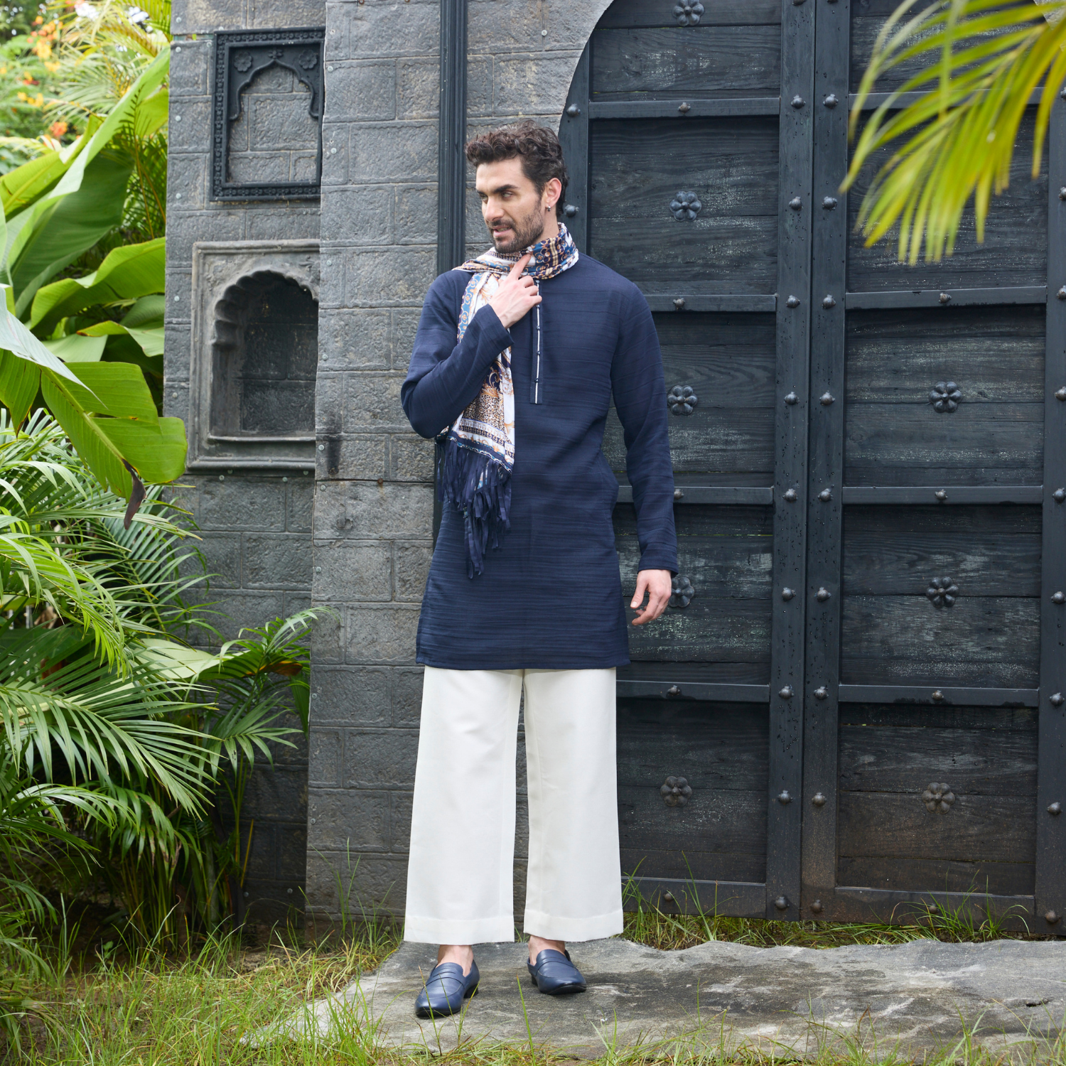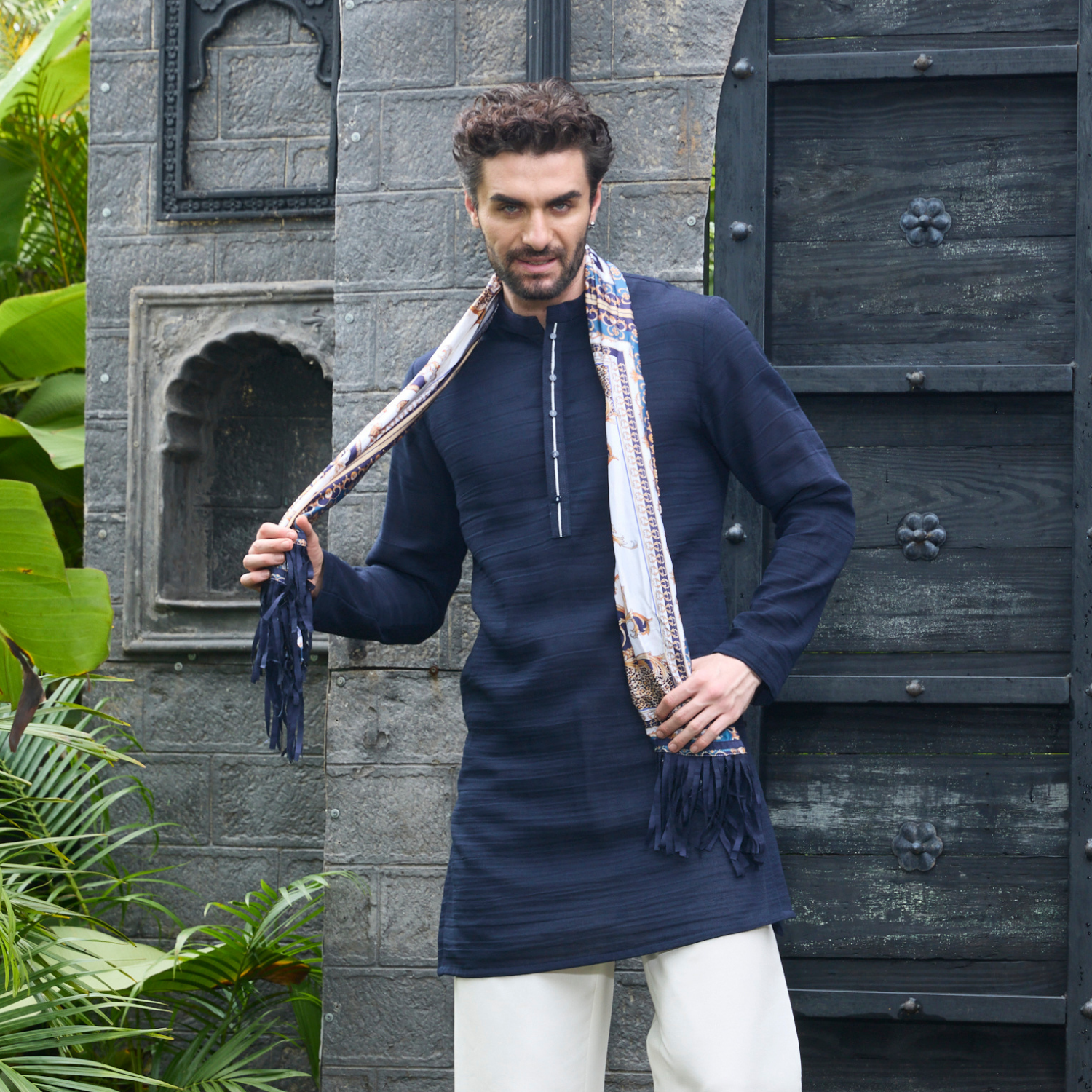 Midnight blue translucent kurta with white placket deatiling.The ensemble is paired with matching trouser & accessorised with a scarf.