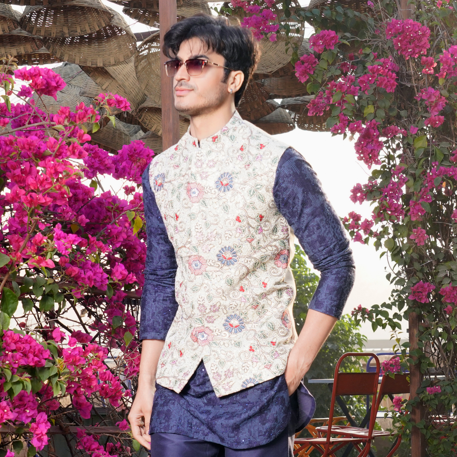 Off white floral embroided jacket. Paired with coordinated midnight blue milange embroidered short kurta. Matching flared trouser for bottom.