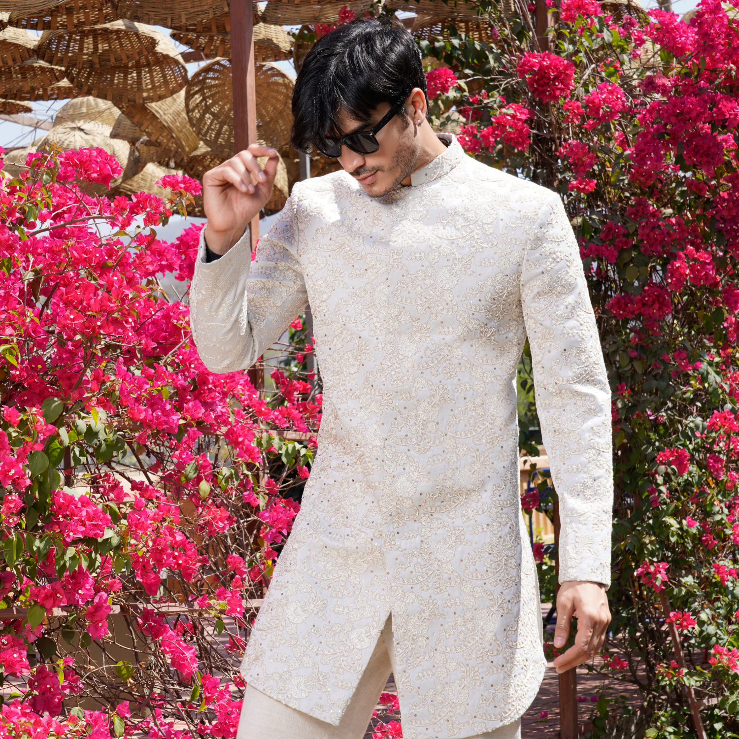 Off white short bandhgala with hand embroidery and sequins detailing. Paired with coordinated flared trouser.