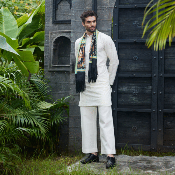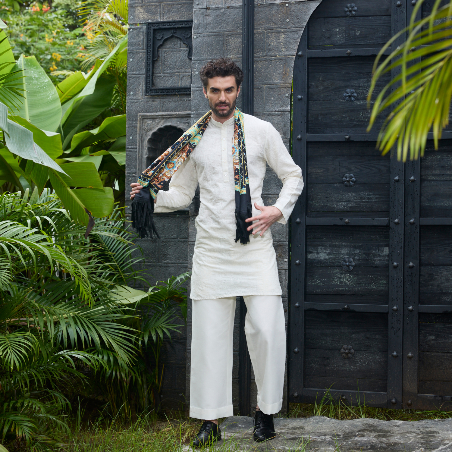 Off white short kurta with surface detailing of Medieval embroidery all over. The ensemble is paired with matching trouser & accessorised with a scarf.