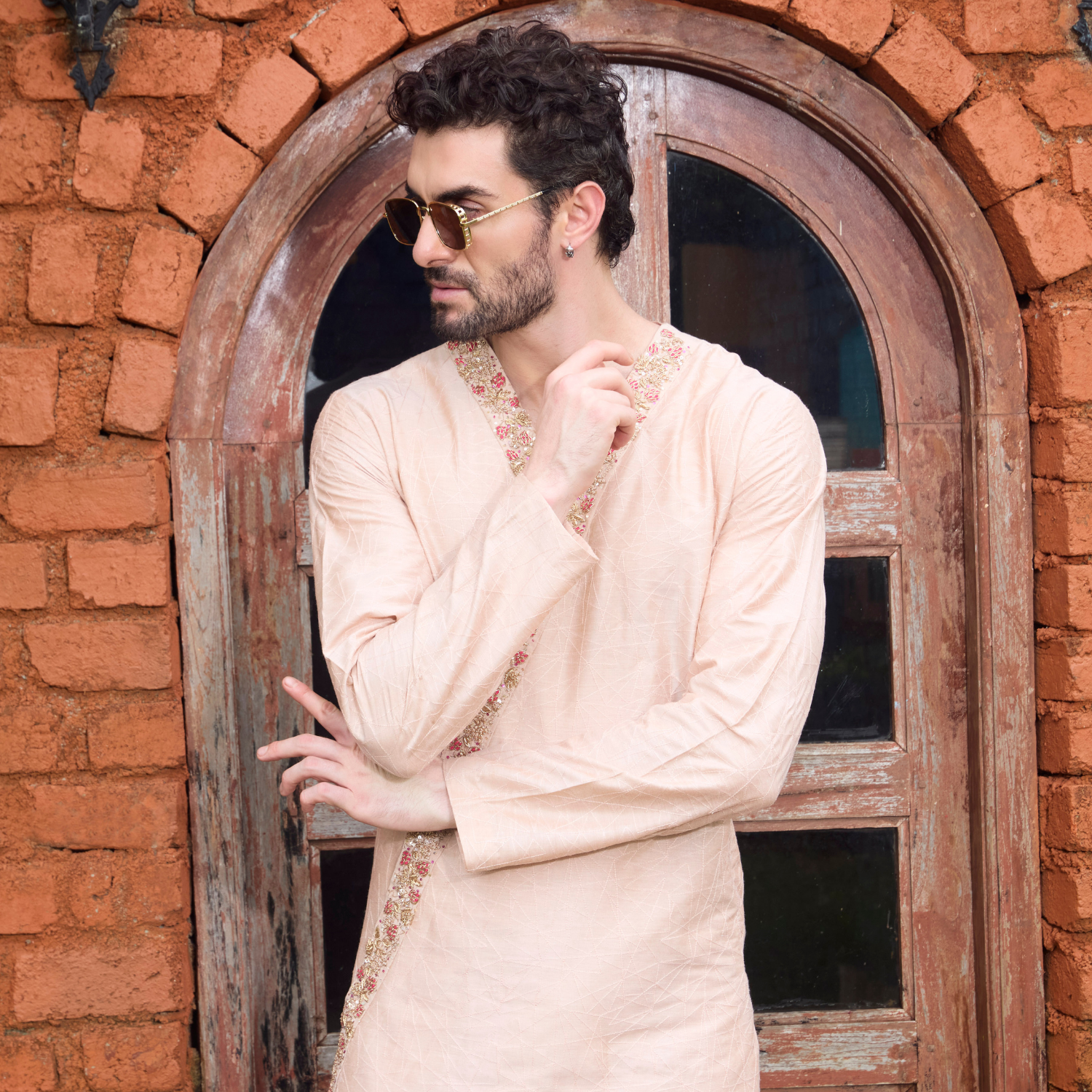 Old rose overlapping Kurta featuring Hops and Leaves embroidered & paired with matching trouser.