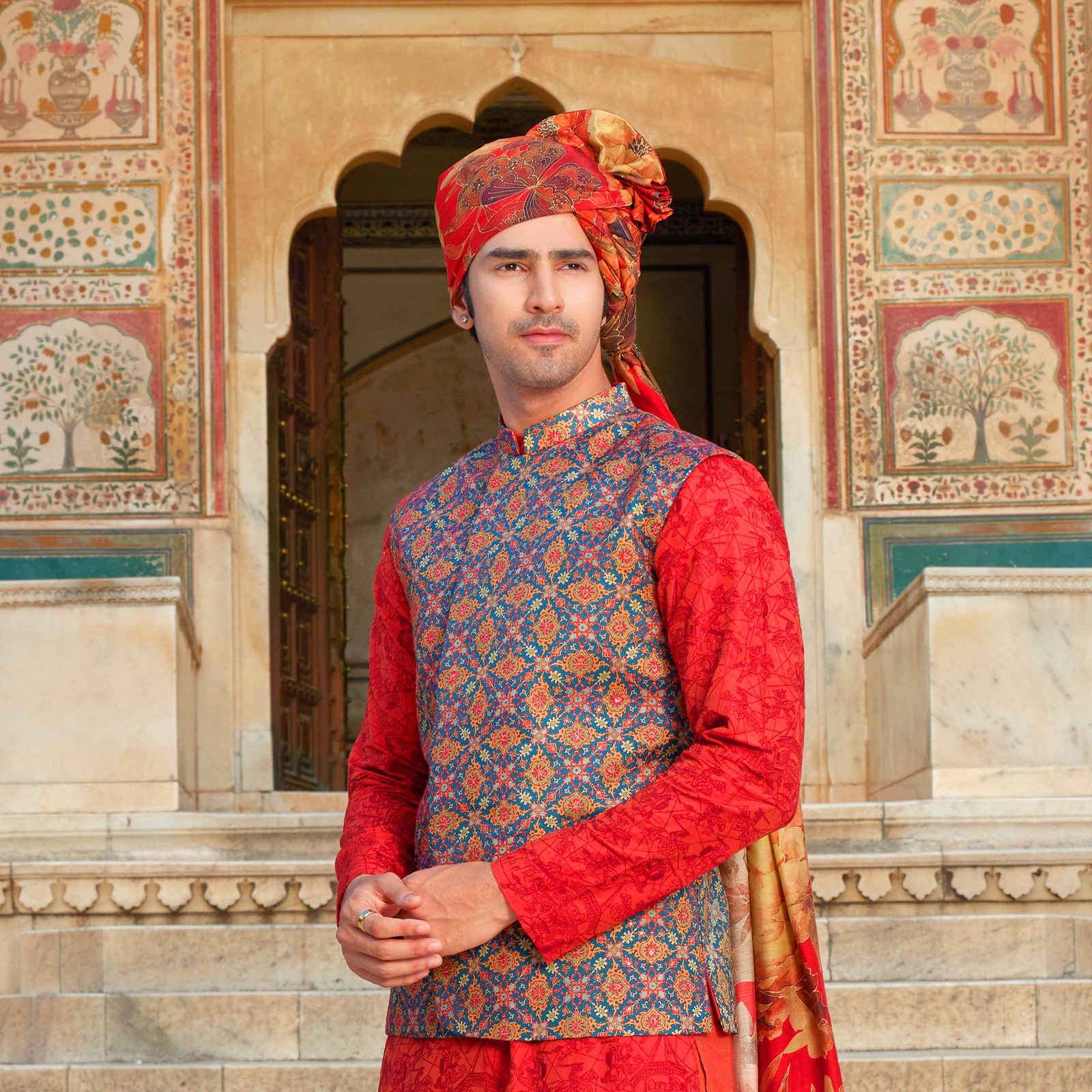 Printed overlapped jacket with sequence & thread detailing all over. The ensemble is paired with surface detailing of Forts embroidered sienna kurta. Beige dhoti for bottoms. Accessorised with coordinated safa. Styled with brown loafers.
